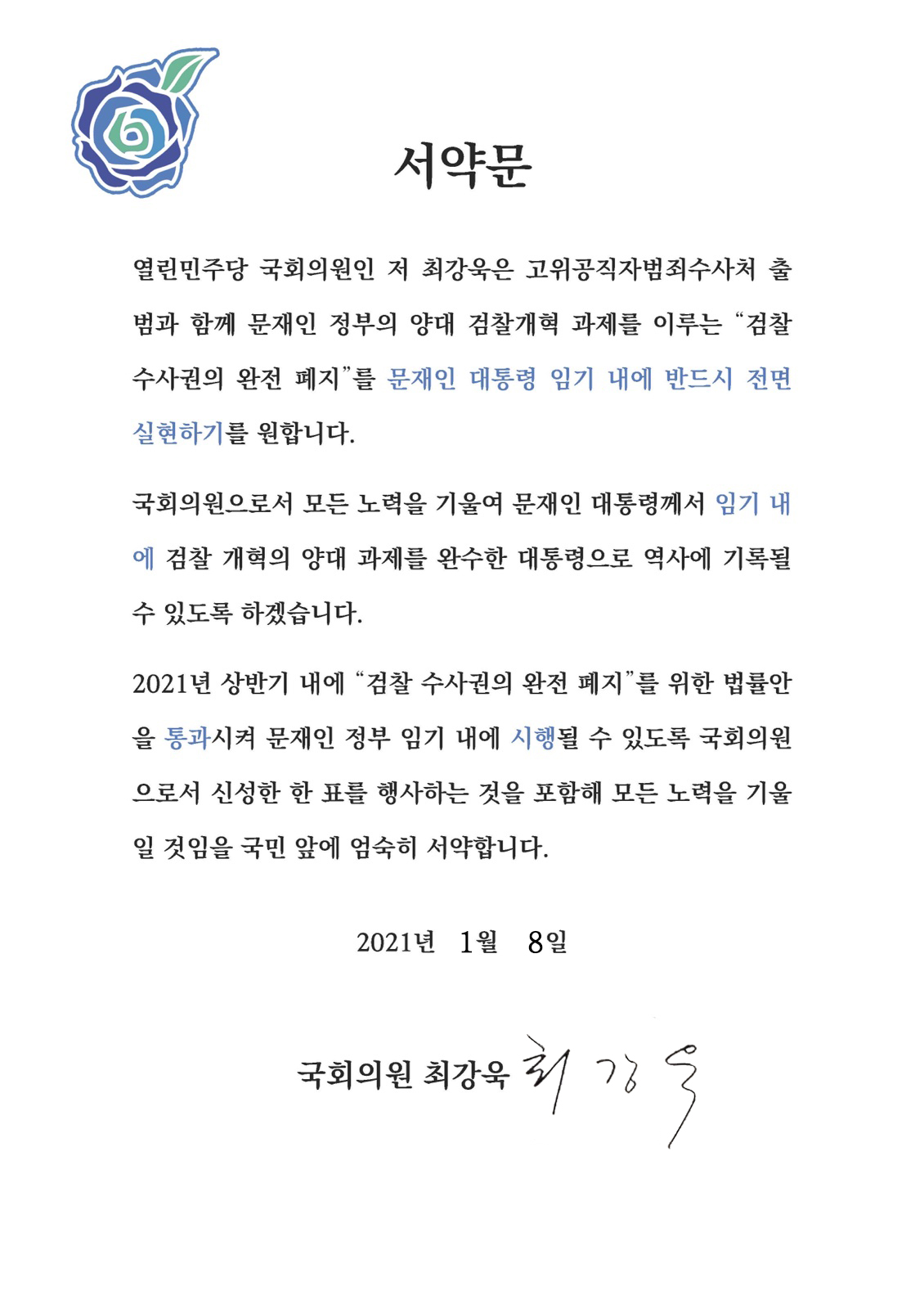 2021년 상반기 내에 “검찰 수사권의 완전 폐지”를 위한 법률안을 통과시켜 문재인 정부 임기 내에 시행될 수 있도록 국회의원으로서 신성한 한 표를 행사하는 것을 포함해 모든 노력을 기울일 것임을 국민 앞에 엄숙히 서약합니다.
